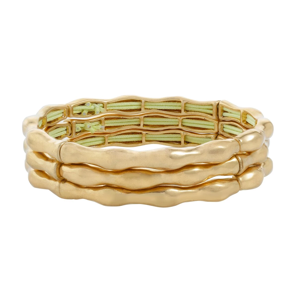 The sleek and simple style of the Bella Uno worn gold triple bamboo bangle bracelet set will enhance any ensemble.