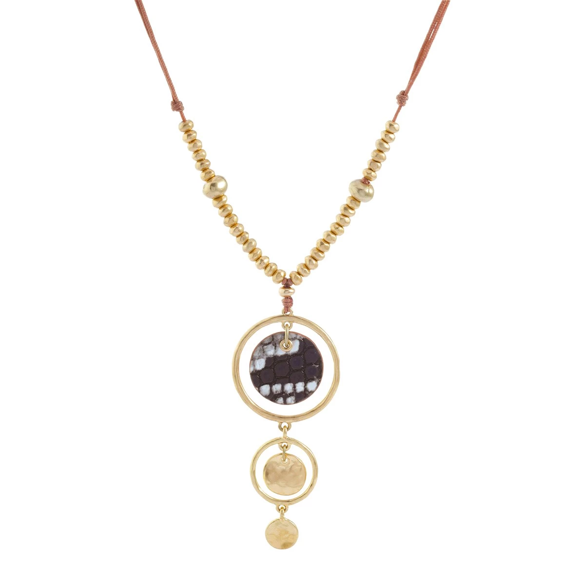 Add a chic finish to your ensemble with this charming Bella Uno worn gold leather and metal triple disc pendant necklace.