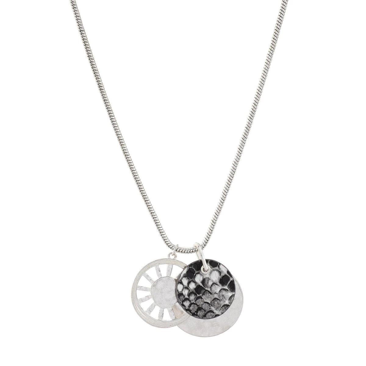 You’ll shine wearing this fabulous Bella Uno worn silver double pendant necklace.