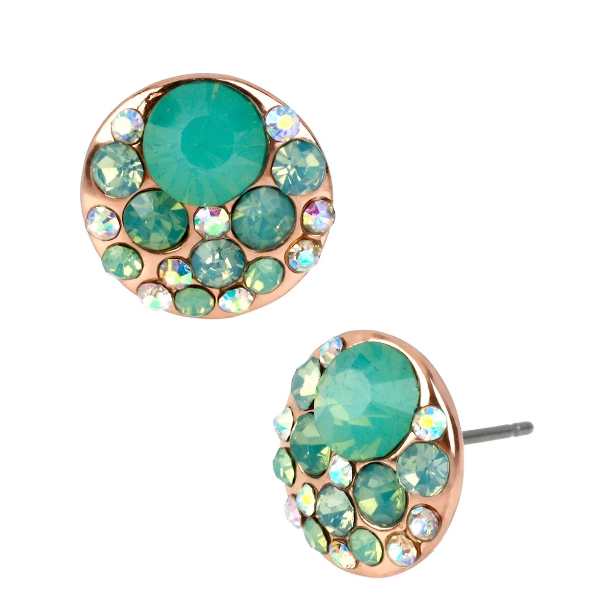 Betsey Johnson rose gold tone round stud earrings with multi blue crystal accents.