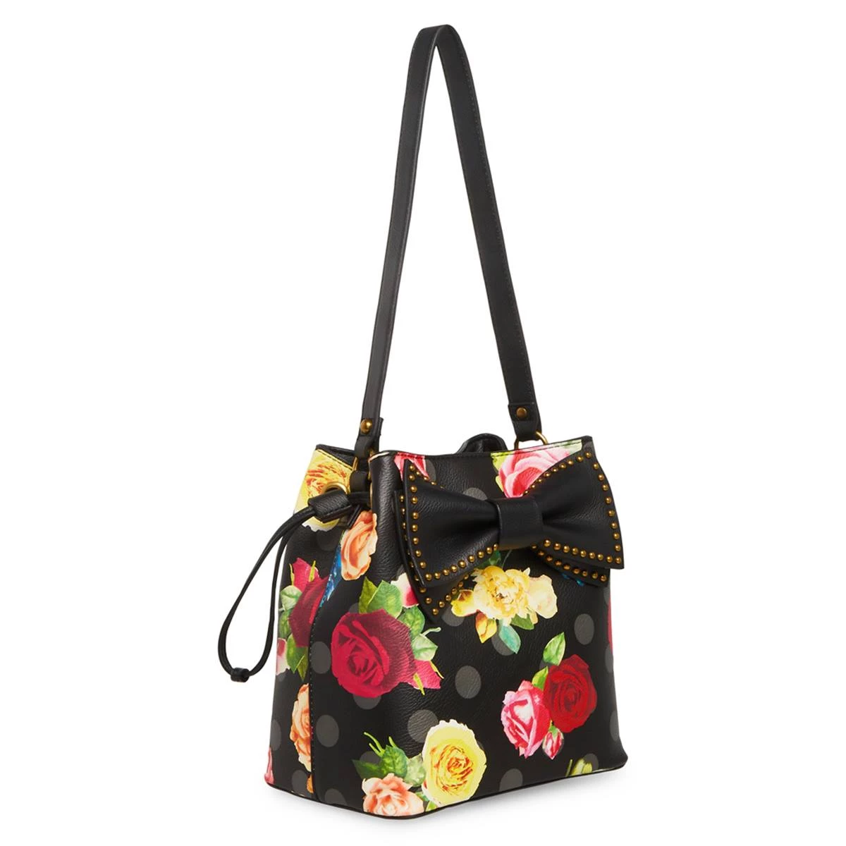 Make a bold style statement carrying this Betsey Johnson comin’ up roses bucket bag. With a large bow with stud details, this chic bag includes a single strap, dual magnetic snap closure compartments, center slip compartment, and drawstring sides.