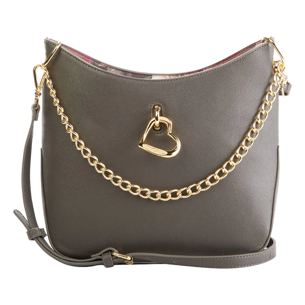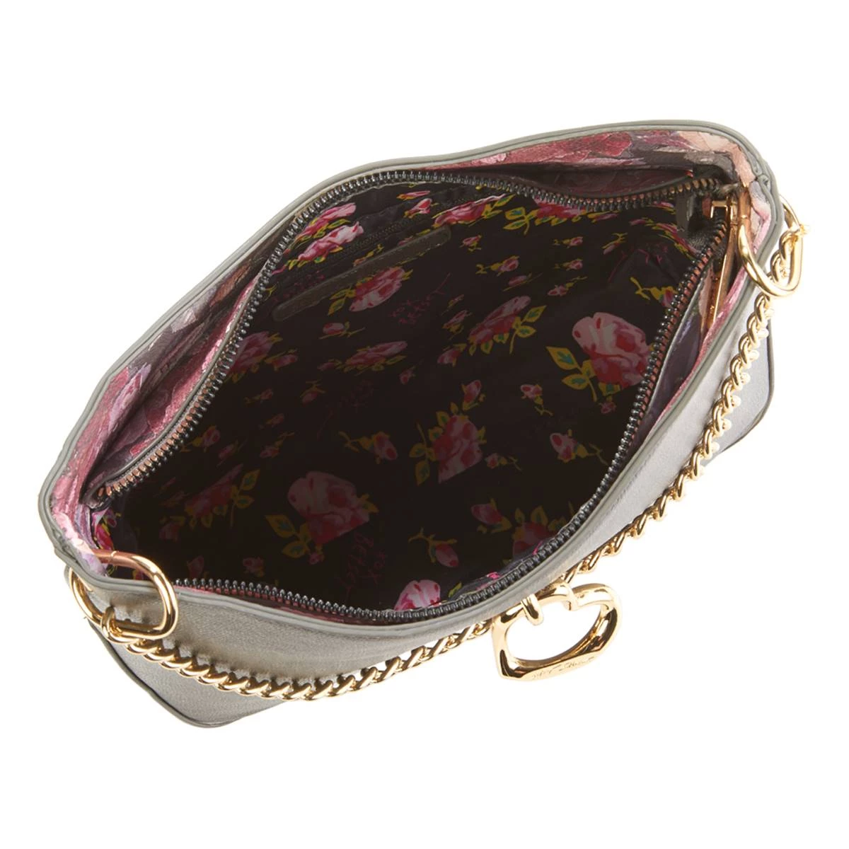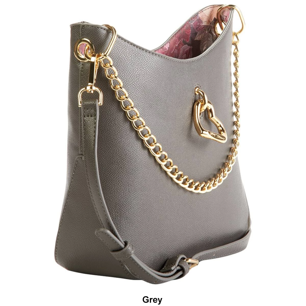 Wear this Betsey Johnson top zip convertible bucket hobo in two different ways. Providing a detachable crossbody strap, chain shoulder strap, easy to use top zip closure, and a pretty signature logo embellishment on the front.