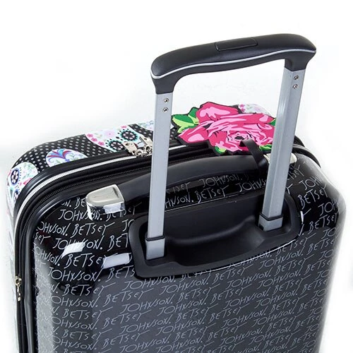 This Betsey Johnson skulls 20-inch carry-on hardside spinner luggage decorated with colorful skulls and black and white polka dots is a winning combination. The durable exterior is perfect for traveling and has eight spinner wheels, a three-stage push button locking handle, and a carrying side handle. The interior is fully lined and features tie-down straps and a zippered compartment. The versatile spinner also expands for additional packing space.