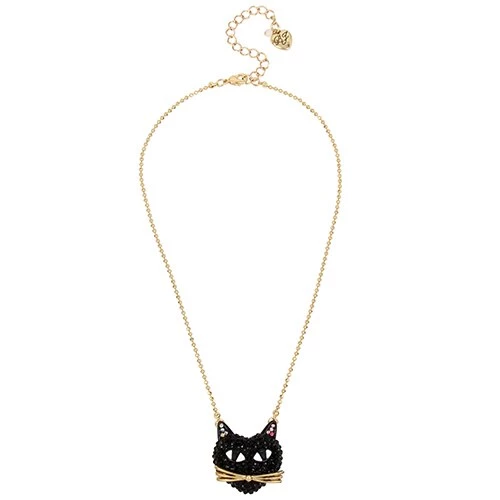 Betsey Johnson necklace features a gold-tone chain with a black cat pendant with pave crystal accents and lobster claw closure.