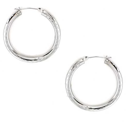 Candela 14kt. white gold diamond cut hoop earrings with click top closure.